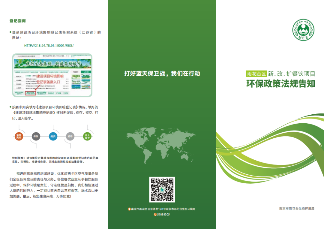 为服务南京市雨花台区高质量发展,帮助企业依法依规经营,从源头控制餐饮油烟污染,有效解决群众身边环境问题。雨花台生态环境局根据《中华人民共和国大气污染防治法》、《江苏省大气污染防治条例》以及国务院《建设项目环境保护管理条例》等法律法规,就餐饮项目在选址、油烟处置及项目申办等方面要求,在全市环保系统率先编制了《雨花台区新、改、扩餐饮项目环保政策法规告知手册》,并联合雨花台区市场监督管理局共同开展对全区餐饮新、改、扩项目环保事先告知服务。