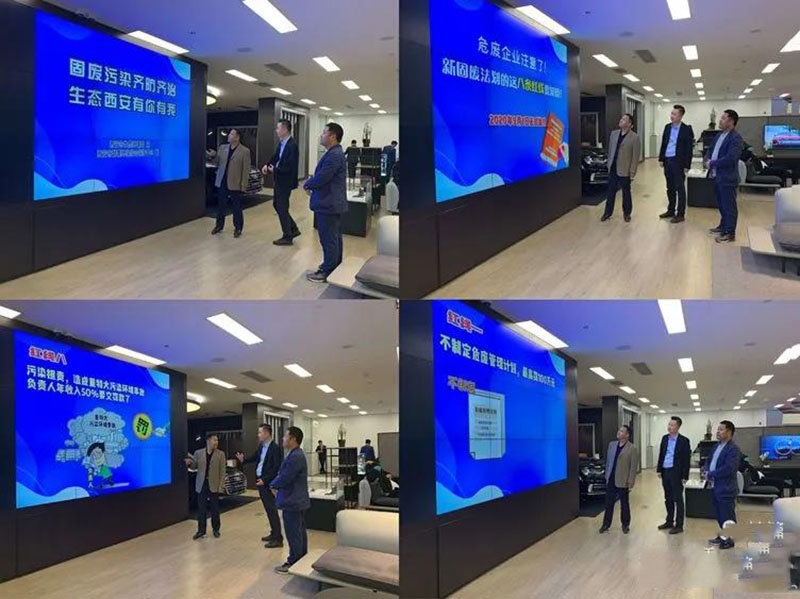 在陕西新丰泰汽车有限责任公司,利用多媒体对企业相关人员进行《固体法》宣贯,并查看公司危废暂存点规范化管理情况。经查,该单位危废分类存放,标识清楚,台账记录完整,危废处置规范。