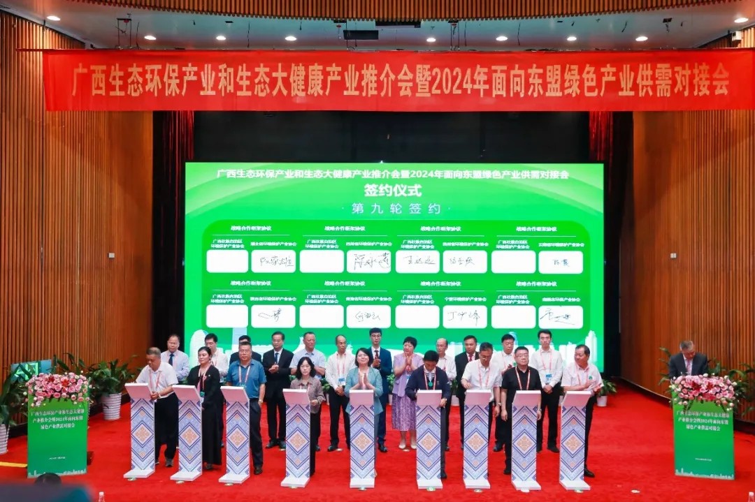 在第21届中国—东盟博览会、中国—东盟商务与投资峰会隆重召开之际,9月25日,广西生态环保产业和生态大健康产业推介会暨2024年面向东盟绿色产业供需对接会在南宁成功举办。广西壮族自治区生态环境厅党组成员、副厅长张兴赢出席会议并致辞,二级巡视员潘国尧主持会议。自治区文化和旅游厅、工业和信息化厅、自然资源厅,14个设区市人民政府、投资促进局、生态环境局,东盟国家商协会,中国环保产业协会,四川、山东等16省环保产业协会,以及来自全国各地企业家代表共400余人参加活动。