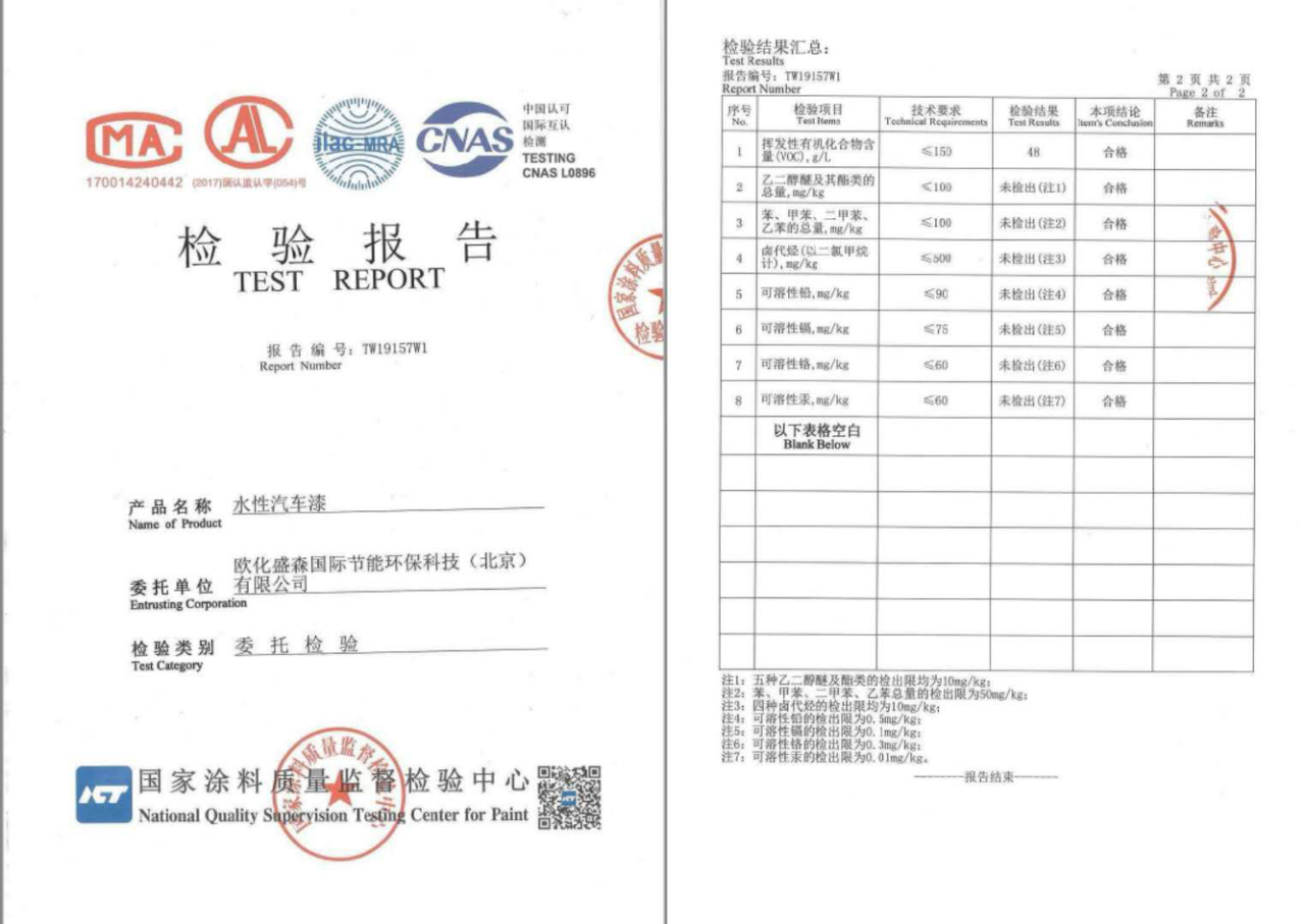 奥奥地水性汽车漆经国家涂料质量监督检验中心检测全部合格