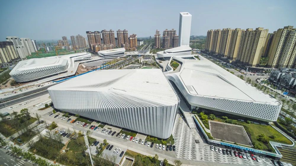 这是2022年4月7日拍摄的简阳文体中心游泳馆(左),成都大运会跳水项目的比赛将在这里举行。新华社发(成都大运会执委会供图)