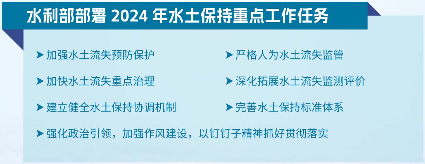 2024年2月8日,水利部办公厅印发了《2024年水土保持工作要点》,全面贯彻落实党的二十大和二十届二中全会精神,深入贯彻习近平生态文明思想和习近平总书记关于治水重要论述精神,落实中共中央办公厅、国务院办公厅《关于加强新时代水土保持工作的意见》和2024年全国水利工作会议精神,推动新阶段水土保持高质量发展。