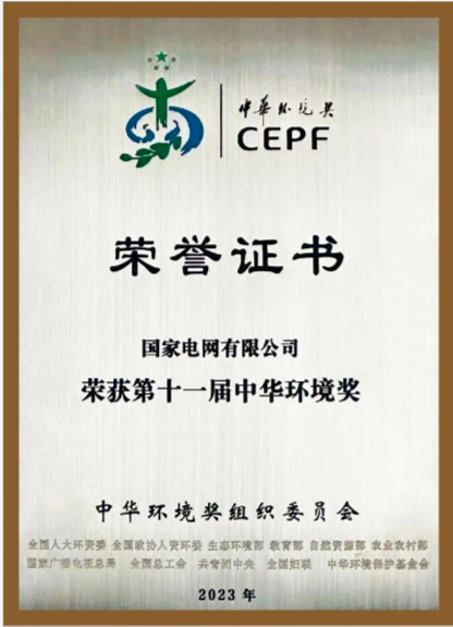 2023年7月20日,第十一届中华环境奖颁奖典礼在北京人民大会堂举行,国家电网有限公司获颁中华环境奖(企业环保类)。