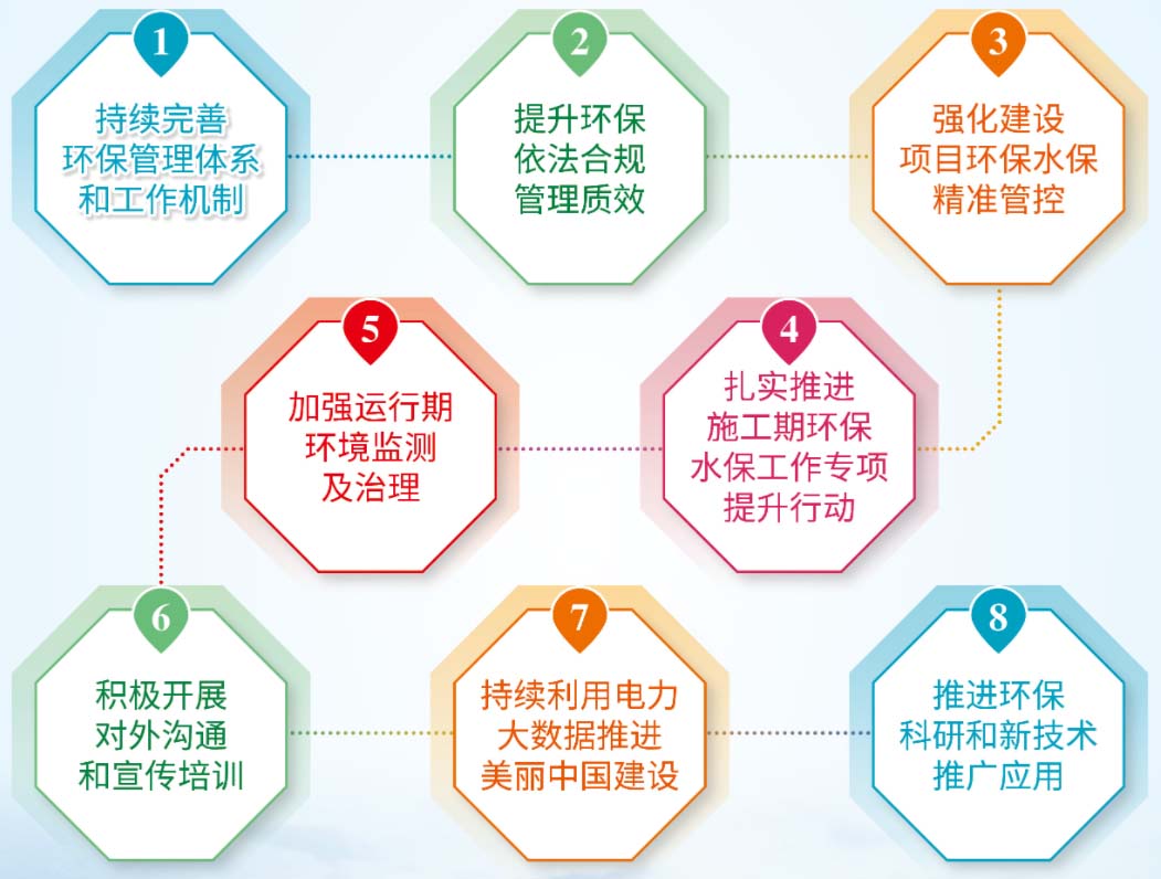 国家电网有限公司提出“业务全覆盖、管理全过程、责任全链条、制度全贯通,严格控制环境影响与合规风险”的环境保护管理要求,确保实现“程序合法、监测达标、环境友好、公众满意”的环境管理目标。